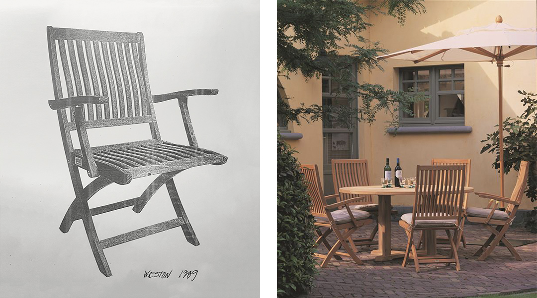 Around the same time in which operations were being transferred from Bristol to Kingfurn, a circumstantial encounter would introduce Paul to the man who would quickly ascend to the post of designer of choice for the reimagined Gloster Brand: Povl Eskildsen. A graduate from the 1986 class of the School of Architecture in Aarhus, Denmark, Povl was presenting his new concept outdoor folding chair at the Copenhagen Furniture Fair when Paul came across his display and immediately recognized the design’s potential. Quite unlike other folding chairs of the period, Povl had incorporated an innovative lumbar support in the back, utilized a different folding principle that kept the front of the seat visible when folded, and included a simple, integrated handle that could be used for folding and carrying the chair. In short order a deal was struck and the iconic Weston Folding Chair was born. As the first foray into the innovative design sphere that Gloster would make, this collection would come to sell well over 20,000 units per year at the peak of its run.