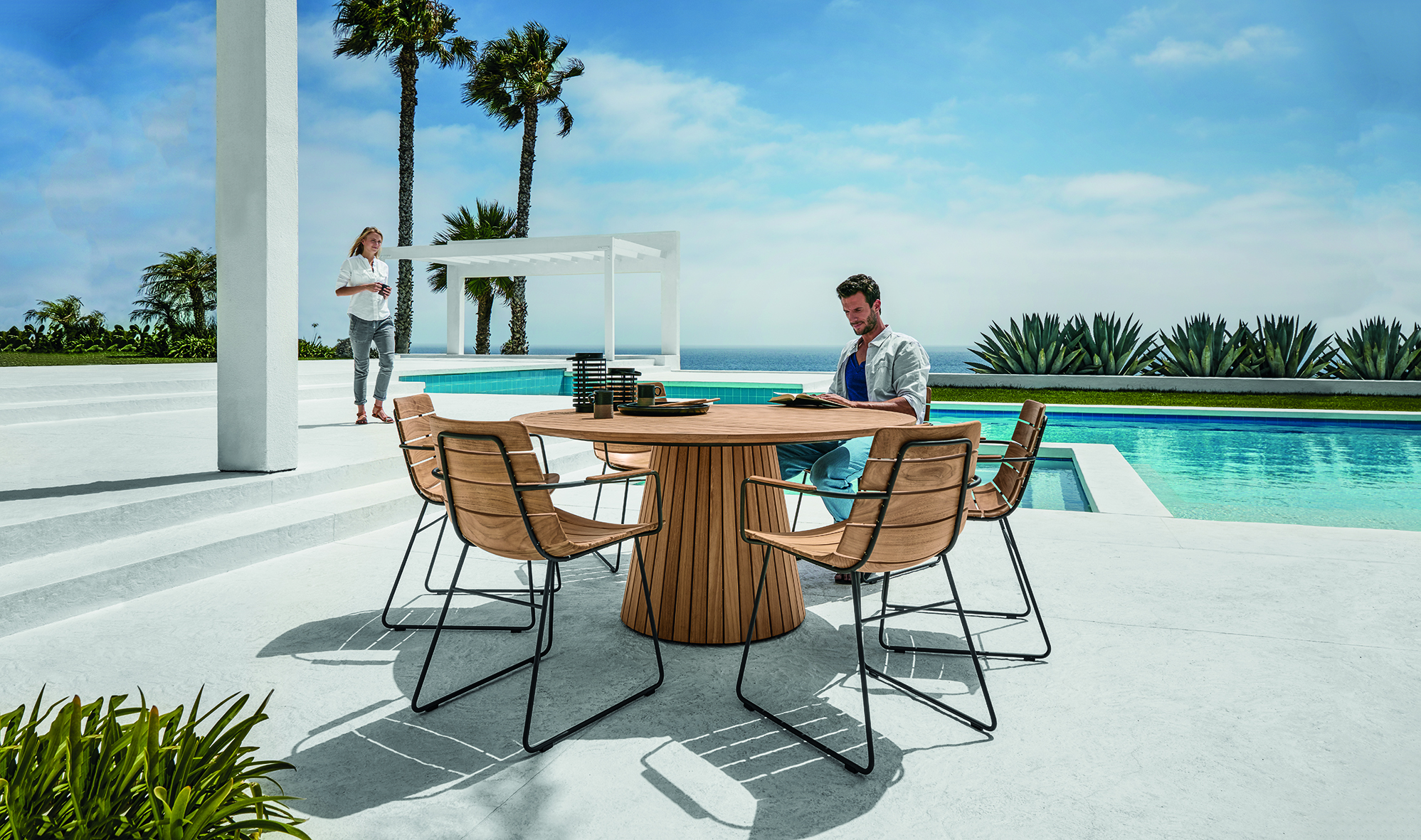 Gloster’s DUNE collection surrounds an outdoor fireplace, while VOYGER chairs make for a poolside favorite.
